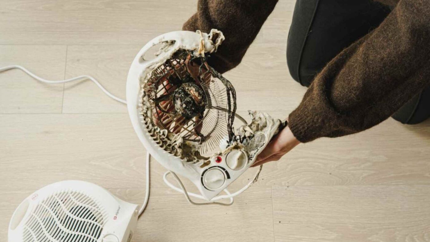 Små vifteovner velter lett. Denne ble liggende mot gulvet, ble overopphetet og startet en boligbrann. Frende Forsikring