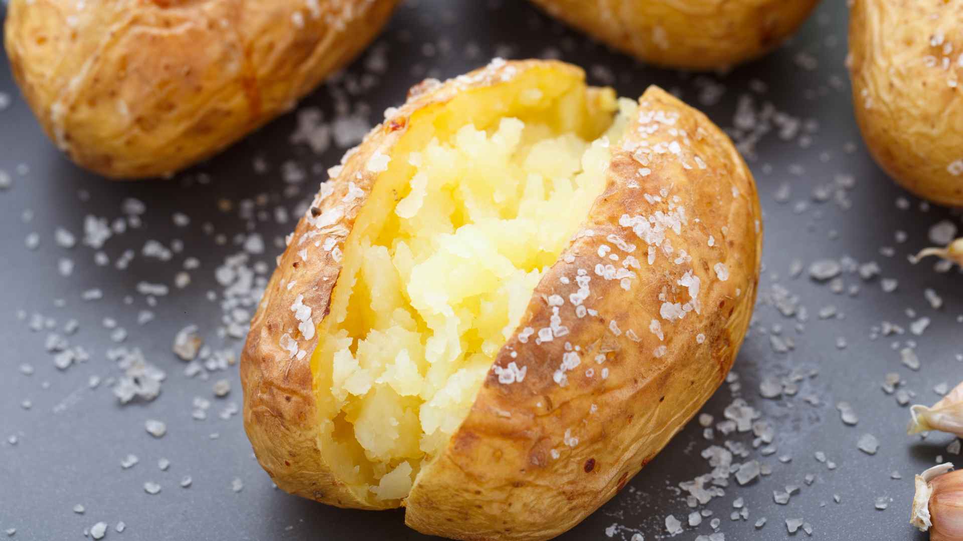 Et lite tips er å skjære et kryss på toppen av poteten og klemme den forsiktig sammen slik at den åpner seg. Da får du en perfekt lomme for fyllet.