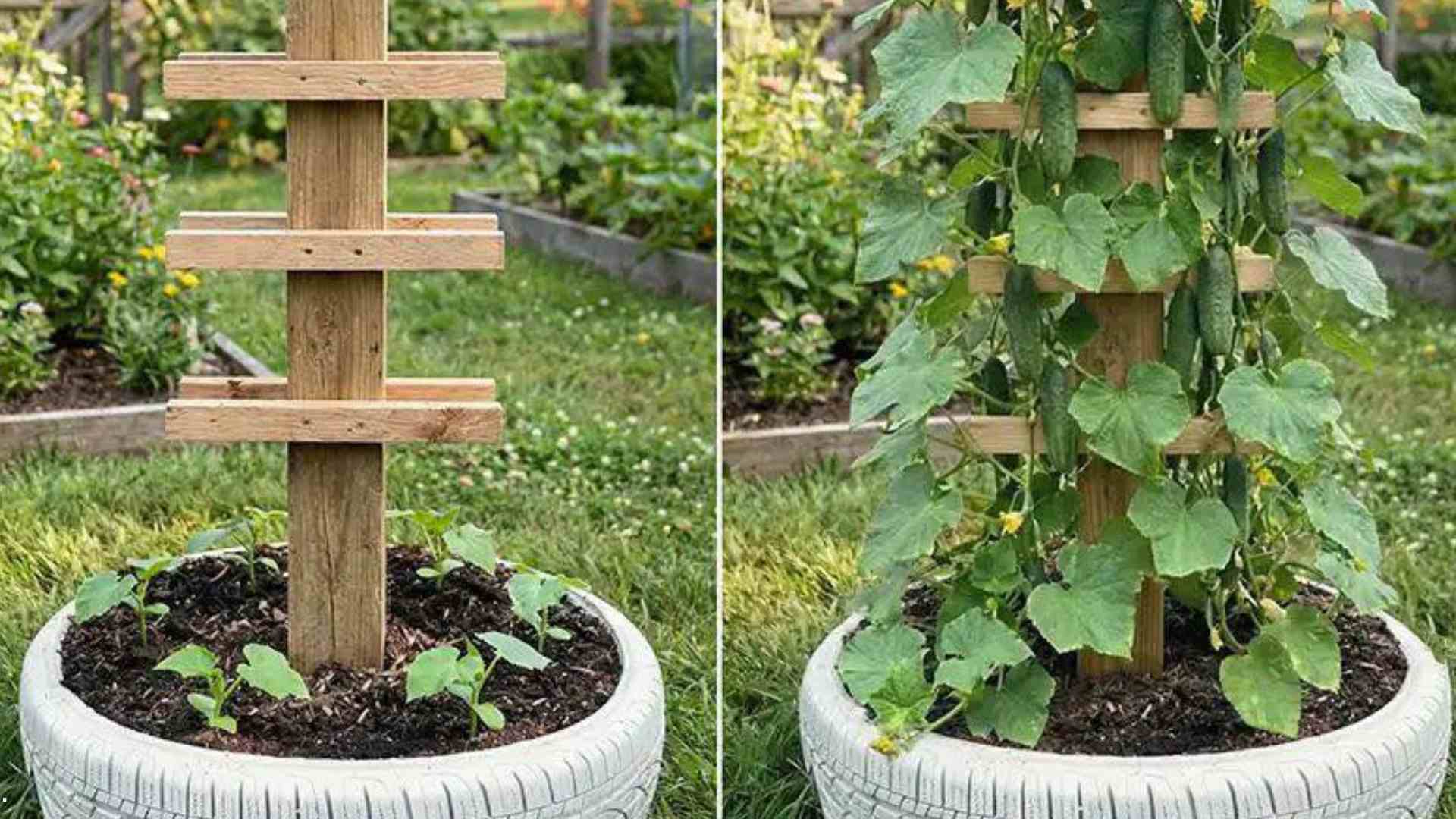 Hvis du planter flere planter rundt stativet, kan de vokse sammen og dekke hele konstruksjonen. Resultatet kan bli en grønn søyle full av agurker – nesten som et lite grønnsakstårn i hagen.