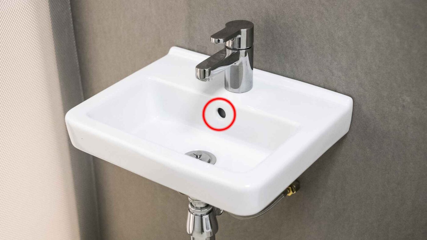 Hullet du ser på innsiden av vasken kalles et overløp. Det er rett og slett en sikkerhetsfunksjon som skal forhindre at vannet renner over kanten dersom du glemmer å skru av kranen, eller hvis avløpet plutselig tetter seg.