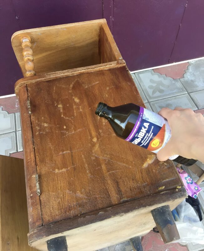Først fjernet hun den gamle overflaten med en malingsfjerner. Det tok tid, men resultatet ble et rent og jevnt underlag.