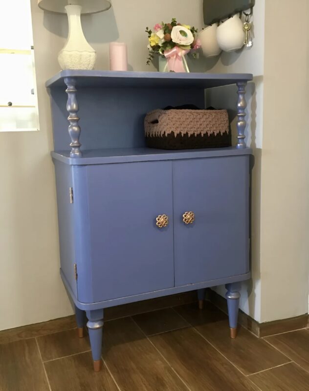 Hun valgte en nydelig pastellblå farge som frisket opp møbelet, men samtidig lot det beholde sitt klassiske uttrykk. Håndtakene ble byttet ut med vintage-inspirerte knotter i gull, og beina ble fornyet for å gi bedre stabilitet.