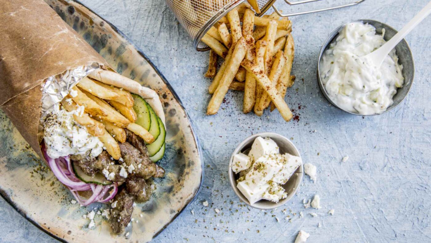 Lengter du tilbake til greske feriedager med sol, varme og fantastisk mat? Da bør du prøve denne oppskriften på hjemmelaget gyros! Møre kjøttstrimler marinert med urter og hvitløk, servert i varme pitabrød med sprø pommes frites, kremet tzatziki og friske grønnsaker – akkurat slik de serverer det i Hellas. Denne oppskriften er etter inspirasjon fra matprat.