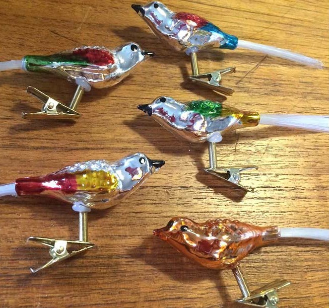 Små pyntede fugler som vippet når noen gikk forbi treet. De var skjøre og tålte lite, men ga liv og bevegelse til granen. Mange forsvant én etter én, men minnene sitter igjen.
