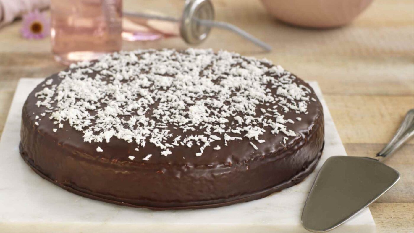 Skjær forsiktig langs kanten av formen og fjern kakeringen. Sett kaken på en rist og hell over glasuren. Dryss kokosmasse på toppen mens glasuren fortsatt er myk. La kaken stå kjølig til glasuren har stivnet.
