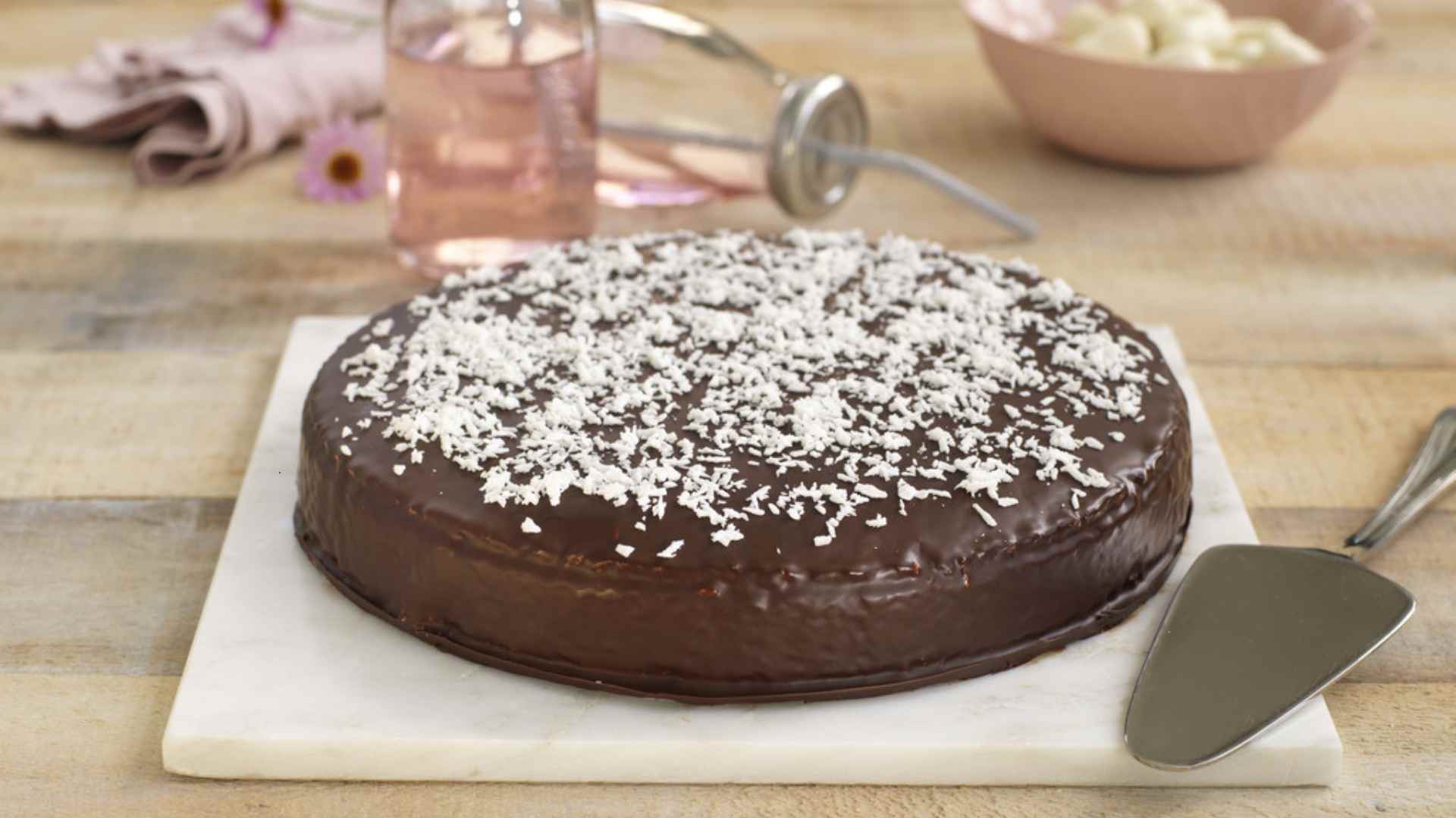 Skjær forsiktig langs kanten av formen og fjern kakeringen. Sett kaken på en rist og hell over glasuren. Dryss kokosmasse på toppen mens glasuren fortsatt er myk. La kaken stå kjølig til glasuren har stivnet.