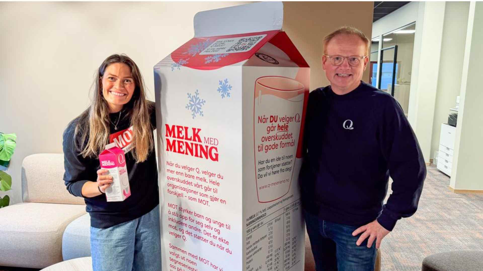 – Vi i Q tror på kraften i små handlinger. Når humoren og varmen i Storefri kombineres med MOTs verdier, kan både ungdom og voksne inspireres til å se hverandre og bry seg. Det kaller vi Melk med mening, sier Q-sjef Kristine Aasheim.