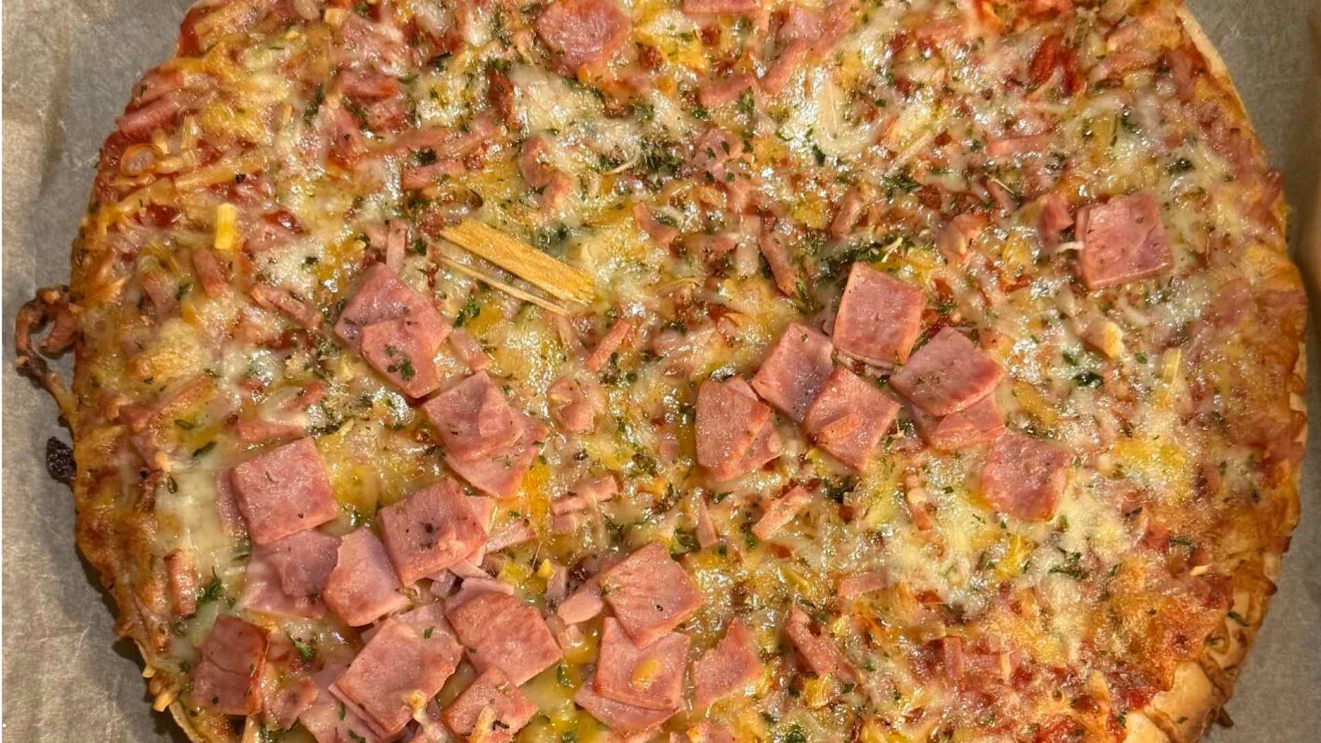 – Da jeg sjekket nærmere, så jeg at det var to store biter med sagflis og en del små biter med sagflis over hele pizzaen.