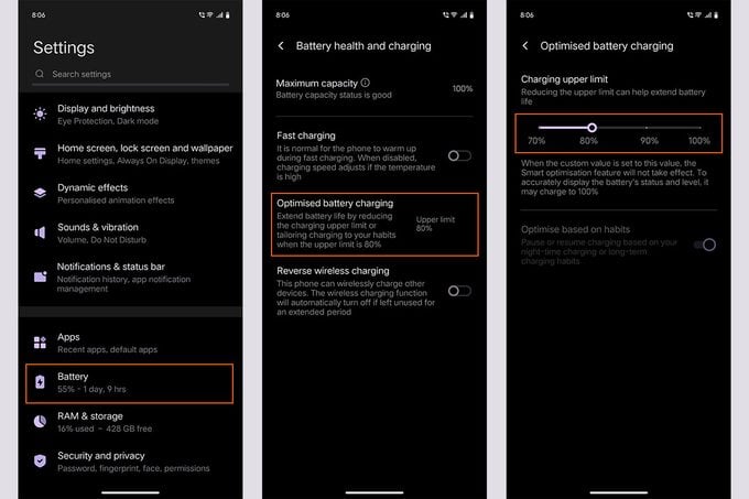 Det kan være uvant å ikke se batteriikonet på 100, men ekspertene anbefaler å holde seg mellom 20 og 80 prosent. På nyere iPhone-modeller (fra iPhone 15) kan du til og med stille inn en «Charge Limit» som automatisk stopper ladingen ved en valgt prosent. Android-telefoner har lignende funksjoner, ofte kalt «Protect Battery» eller «Optimalisert lading».