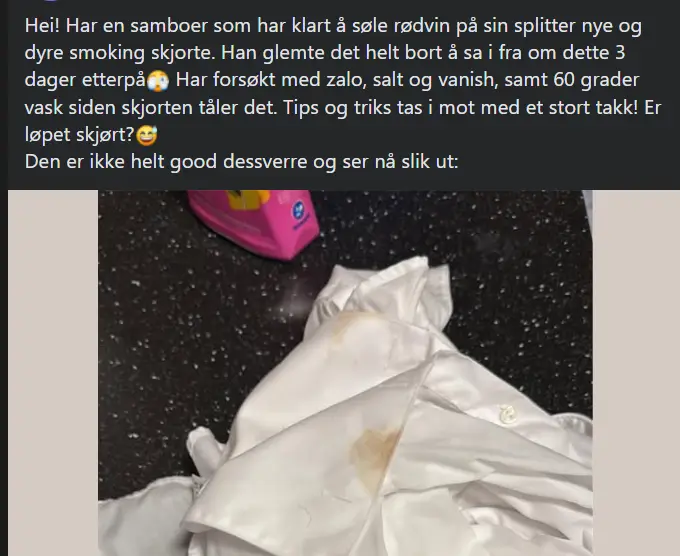 Tre dager senere ble flekken oppdaget. Da var skjorten allerede vasket, både med flekkfjernere og på høy temperatur. Likevel satt rødvinsmerkene igjen.